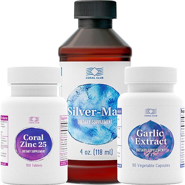 Сильвер-Макс (1 упаковка,118 мл), Экстракт чеснока (1 упаковка, 90 капсул), Корал Цинк 25 (1 упаковка, 100 таблеток).